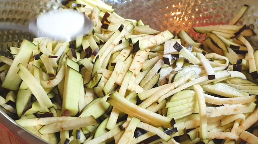 가지채전의 핵심은 재료를 최대한 얇게 써는 것이다. 가지 2개를 준비해 흐르는 물에 씻은 뒤 꼭지를 제거한다. 길이 방향으로 반을 가르고, 다시 얇게 채를 썬다. 너무 두껍게 썰면 익는 시간이 오래 걸리고 식감이 물컹해질 수 있다. 0.3~0.5cm 정도의 가는 채가 적당하다. 채 썬 뒤에는 소금 한 꼬집을 뿌려 10분 정도 두었다가 살짝 숨이 죽으면 손으로 가볍게 물기를 짠다. 이 과정을 거치면 가지 특유의 수분이 빠져 전이 질어지는 것을 막을 수 있다.