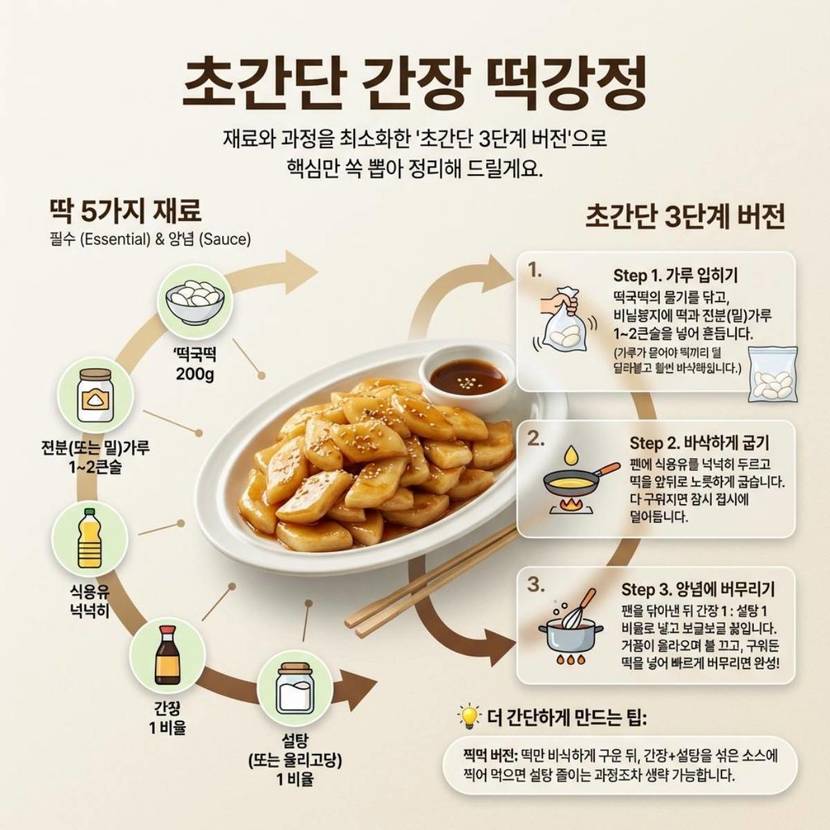 명절이 지나면 냉동실 한켠에 남아 있는 '떡국떡'이 눈에 띈다. 국으로 끓여 먹기엔 질리고, 그냥 구워 먹자니 심심하다. 이럴 때 필요한 건 복잡한 양념이 아니라 초간단 '꿀팁' 레시피 하나다.별도의 마늘, 고추장 없이도 간장과 설탕의 단짠 조합으로 충분한 맛을 낸다. 떡강정 특유의 윤기와 쫀득함이 살아나면서 간식이나 술안주로도 활용 가능하다.핵심은 가루 코팅이다. 떡국떡은 표면이 매끄럽고 수분이 남아 있어 팬에 올리면 서로 달라붙기 쉽다.