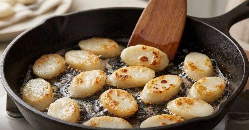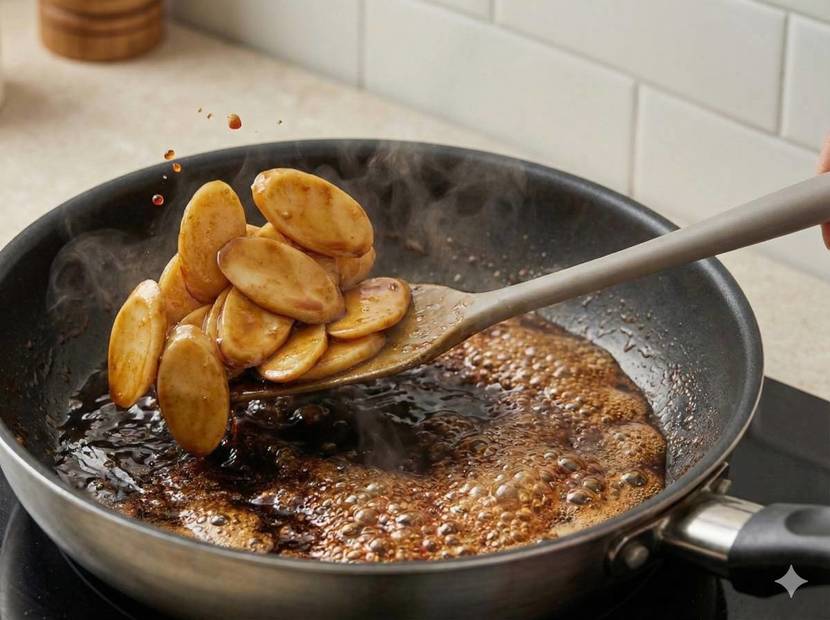 다음은 굽는 과정이다. 팬을 중불로 달군 뒤 식용유를 넉넉히 두른다. 떡을 한 겹으로 펼쳐 앞뒤를 노릇하게 굽는다. 겉면이 살짝 갈색을 띠고 가장자리가 단단해질 때까지 익히는 것이 좋다. 너무 자주 뒤집으면 표면이 고르게 익지 않는다. 겉은 바삭하고 속은 쫀득한 상태가 되면 접시에 잠시 덜어둔다.팬에 떡국떡 익히기. 기사 내용 토대로 AI툴 활용해 제작한 자료사진.