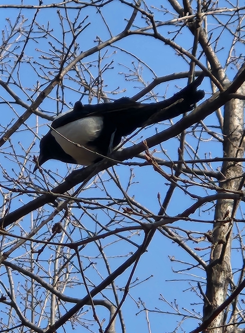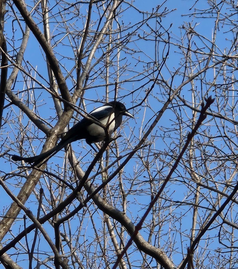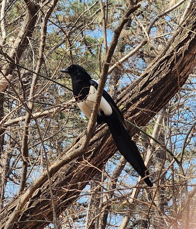 나뭇잎 없는 나무에 애잔하게 앉은 까치