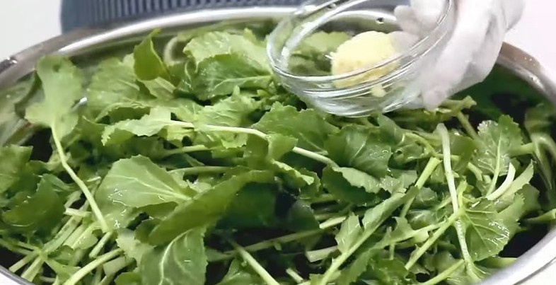조리의 기본은 데치기다. 끓는 물에 소금을 약간 넣고 손질한 유채를 넣는다. 줄기 부분부터 먼저 잠기게 하고, 잎은 나중에 넣어 30초에서 1분 이내로 짧게 데친다. 너무 오래 익히면 색이 탁해지고 질감이 무른다. 데친 뒤에는 곧바로 찬물에 헹궈 열을 식히고, 물기를 꼭 짜야 한다. 이 과정이 제대로 되어야 양념이 겉돌지 않는다.