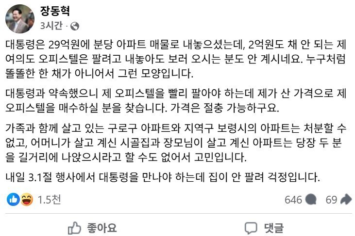 위키트리28일 장 대표는 페이스북을 통해 “대통령과 약속했으니 제 오피스텔을 빨리 팔아야 하는데, 제가 산 가격으로 매수하실 분을 찾는다”며 “가격은 절충 가능하다”고 적었다. 그는 “대통령이 29억 원에 분당 아파트를 매물로 내놨는데, 2억 원도 채 안 되는 제 여의도 오피스텔은 팔려고 내놓아도 보러 오시는 분이 안 계신다”고 주장했다. 이어 “누구처럼 ‘똘똘한 한 채’가 아니어서 그런 모양”이라고 덧붙였다.