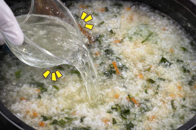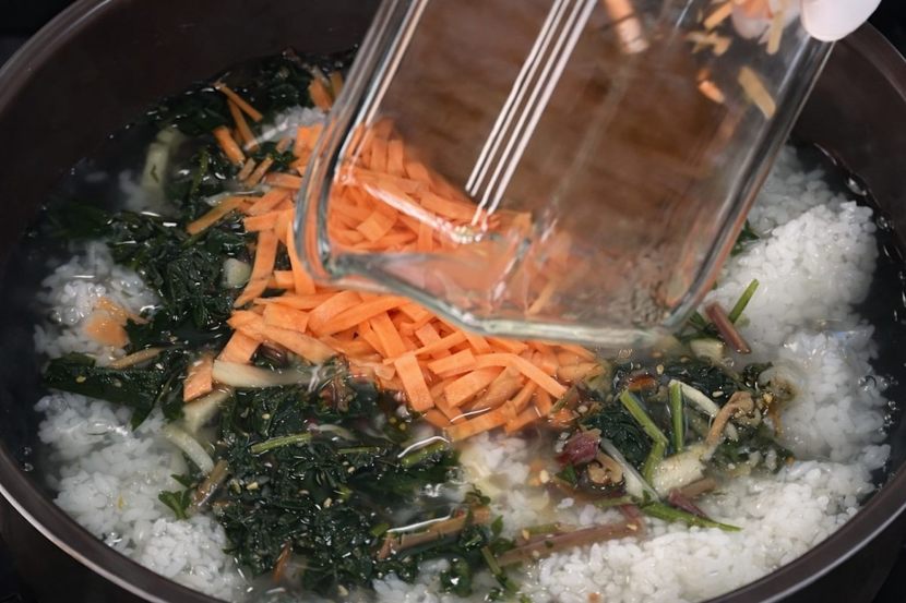 고사리나물, 시래기나물, 취나물, 도라지나물 등 종류는 크게 상관없다. 여기에 당근, 달걀흰자, 소금, 참기름, 김가루를 더한다. 나물은 1cm 내외로 잘게 썰어 준비한다. 당근도 비슷한 길이로 채 썰어 색감을 더한다. 길쭉하게 남지 않도록 잘게 정리하는 것이 식감에 도움이 된다.냄비에 흰밥 약 500g을 넣고 물 약 1,300ml를 한 번에 부어 끓인다. 물의 양은 죽의 완성도를 좌우하는 핵심 요소다. 끓이다가 부족하다고 중간에 물을 여러 차례 추가하면 밥에서 우러나는 고소한 맛이 옅어질 수 있다. 처음부터 적정량을 잡아 끓이는 것이 중요하다.