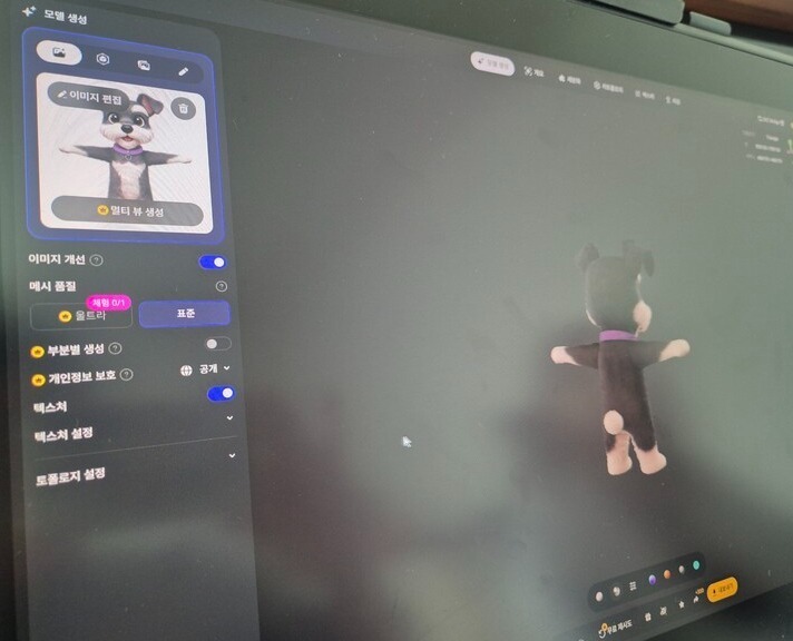김씨에게 AI를 활용한 3D 모델링 시연을 요청했다. PC로 챗GPT에 접속한 그는 짤막한 프롬프트를 입력했다. “강아지 슈나우저 캐릭터를 디즈니 스타일로 그려줘. T포즈(양팔을 벌린 포즈)로 3D 모델링에 쓸 수 있게 만들어야 해. 캐릭터에는 연보라색 목줄을 달아줘. 귀엽게 부탁해.” 30초도 되지 않아 눈이 동그랗고 흰 수염을 가진 강아지가 두 앞 발을 벌린 이미지가 나왔다. 김씨는 이를 무료 3D 생성 AI인 ‘블렌더’ 창에 끌어와 생성 버튼을 눌렀다. 1분30초 만에 위, 아래, 앞, 뒤, 옆으로 돌아가는 3D 강아지 모델이 나왔다. 모델러가 직접 만들면 최소 하루이틀, 배경 이미지는 일주일도 걸리는 일이 2분 만에 끝났다.