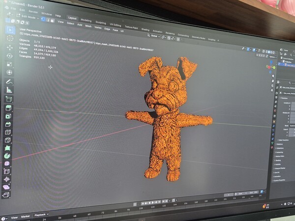 물론 AI가 만든 3D 모델을 곧바로 적용할 수 있는 수준은 아니다. “게임은 결국 ‘데이터 싸움’이에요. 다행히 AI는 리소스까지 고려하지 못하고 쓸 데 없는 데이터를 덕지덕지 붙여 놔요. 그러면 플레이할 때 ‘렉’이 걸려요.” 특히 수평, 수직선이 많이 쓰이는 배경 모델링은 “아직은 비교적 안전”하다. AI가 수작업에 비해 불필요한 데이터를 가장 많이 만들어내는 영역이다. 실제로 방금 생성한 강아지 모형을 확대하니 통상 한 면으로 처리되는 원통형 몸체 부분이 수많은 면으로 쪼개져 있었다. 전체 면 개수는 95만9130개에 달했다. “아무리 복잡한 고퀄리티 게임의 3D 캐릭터도 면 수가 15만 개를 넘기기 힘들어요. 그만큼 얼토당토 않은 숫자예요.”