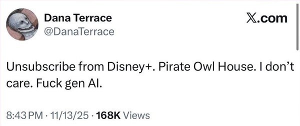 “디즈니플러스 구독 해지하라. ‘아울 하우스’도 불법 다운 받아서 봐라. 상관 없다. 생성형 AI 엿 먹어라.” 디즈니플러스(디즈니+) 인기 애니메이션 시리즈 ‘아울 하우스’를 제작한 애니메이터이자 감독 다나 테라스가 지난해 11월 X(구 트위터)에 쓴 글이다. 밥 아이거 디즈니 CEO가 디즈니+ 구독자들이 생성형 인공지능(AI)으로 직접 콘텐츠를 제작할 수 있는 기능을 지원하겠다고 밝힌 직후 나온 반응이었다.