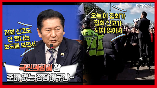 이날 규탄대회에서 장동혁 국민의힘 대표는 “현 정권은 국회 다수당을 앞세워서 야당을 완전히 배제하고 국회를 장악한 채 입법부의 힘으로 사법부를 완전히 파괴하고 있다. 막아야 한다”며 “이재명 대통령께 강력하게 경고한다. 장기 독재의 꿈을 버리고 헌정질서를 수호하기 위해 사법 파괴 3법에 대해서 거부권을 행사해야 할 것이다. 저와 국민의힘은 끝까지, 싸우고 싸워서 대한민국 헌정질서와 법치를 지켜낼 것”이라고 촉구했다. 영상엔 김민수 국민의힘 최고위원이 집회 신고가 안 된 상황을 전하는 장면 등이 담겼다.