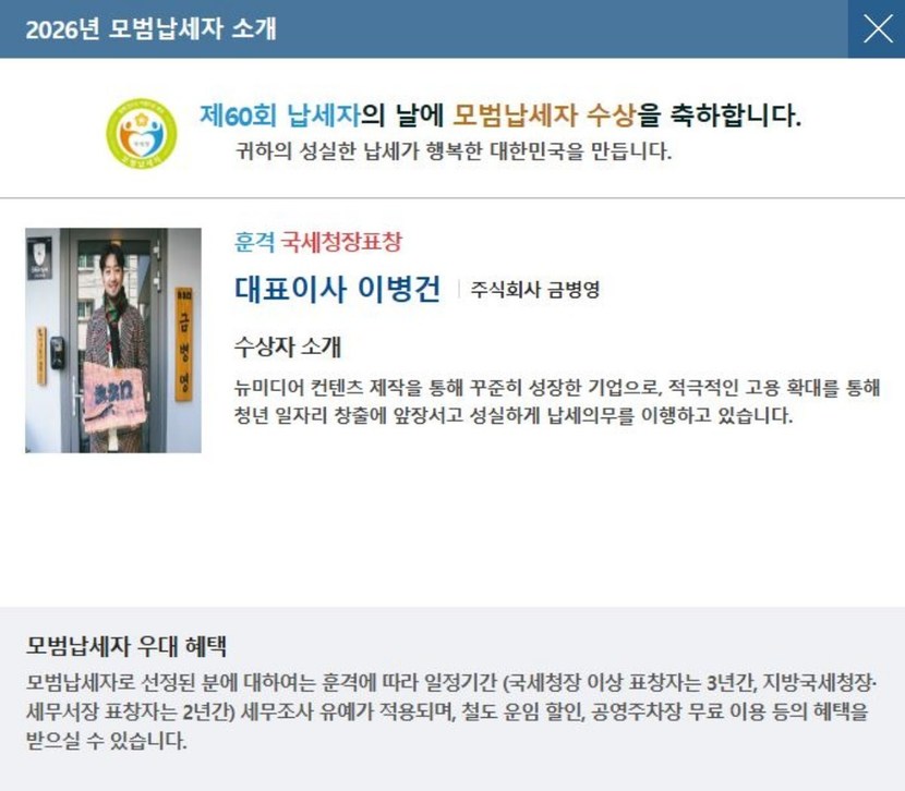 세무서 측은 선정 배경에 대해 뉴미디어 콘텐츠 제작 분야에서 지속적인 성장을 이어온 기업으로서 적극적인 고용 확대를 통해 청년 일자리 창출에 기여하고 성실하게 납세 의무를 이행해 온 점을 높이 평가했다고 설명했다.