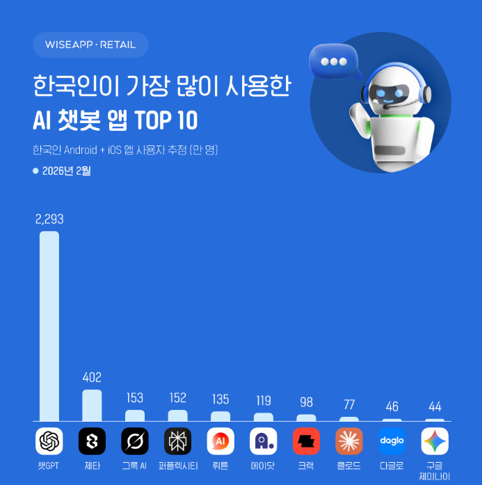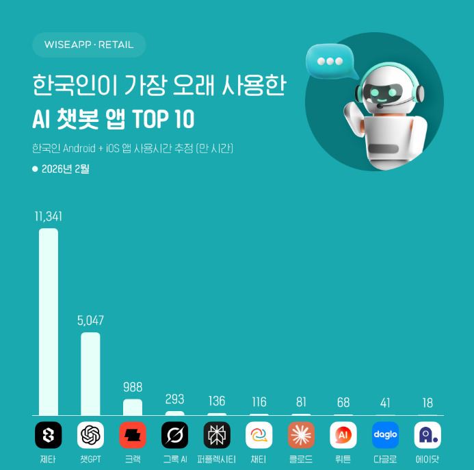 2026년 2월 기준 한국인 스마트폰 사용자가 가장 많이 이용한 AI 챗봇 앱은 챗GPT로 월간 활성 사용자 수(MAU) 2293만 명을 기록했다. 이는 국내 전체 사용자 규모 면에서 압도적인 1위 수치다. 뒤를 이어 제타가 402만 명으로 2위에 올랐으며 일론 머스크의 그록 AI가 153만 명으로 3위를 차지했다. 퍼플렉시티는 152만 명, 뤼튼 135만 명, 에이닷 119만 명 순으로 집계됐다. 크랙(98만 명), 클로드(77만 명), 다글로(46만 명), 구글 제미나이(44만 명) 등이 상위 10위권에 이름을 올렸다. 이번 조사에서 챗GPT를 비롯해 제타, 그록 AI, 크랙, 클로드는 각각 역대 최대 사용자 수를 경신하며 AI 챗봇 시장의 가파른 성장세를 증명했다.사용자 규모와 달리 실제 앱에 머무는 시간을 의미하는 총 사용 시간 지표에서는 다른 양상이 나타났다. 캐릭터형 AI 챗봇인 제타는 한 달간 총 1억 1341만 시간의 사용 시간을 기록하며 1위에 올랐다. 이는 사용자 수 1위인 챗GPT의 기록인 5047만 시간보다 두 배 이상 높은 수치다. 제타와 함께 크랙(988만 시간), 채티(116만 시간) 등 캐릭터 기반 서비스들이 상위권에 포진하며 강력한 사용자 몰입도를 입증했다. 캐릭터와의 지속적인 대화와 스토리텔링 중심의 상호작용, 감정 교류 요소가 결합되면서 단순 정보 검색을 넘어선 체류 시간 증대 효과가 나타난 것으로 분석된다. 그록 AI는 293만 시간, 퍼플렉시티는 136만 시간, 클로드 81만 시간 등을 기록했다.출시 1년을 맞이한 그록 AI의 성장세도 주목할 만하다. 지난해 3월 국내 앱 마켓에 진출한 그록 AI는 출시 직후 23만 명의 사용자를 확보하며 7위로 시작했으나 1년 만에 사용자 수 3위까지 올라섰다. 특히 그록 AI는 최근 미국과 이스라엘의 이란 공습 날짜를 정확히 예측하며 기술적 화제를 모으기도 했다. 앤트로픽의 클로드는 최근 미 국방부와의 갈등을 겪으며 오히려 브랜드 인지도가 상승하는 반사 이익을 얻었다. 앤트로픽이 대규모 감시와 자율 살상 무기 활용을 제한해야 한다는 AI 윤리 원칙을 고수하자 미 국방부가 이를 공급망 위험 기업으로 분류했으나, 이러한 행보가 일반 사용자들에게 긍정적으로 작용하며 클로드의 국내 MAU는 전월 53만 명 대비 45% 급증한 77만 명을 기록했다.