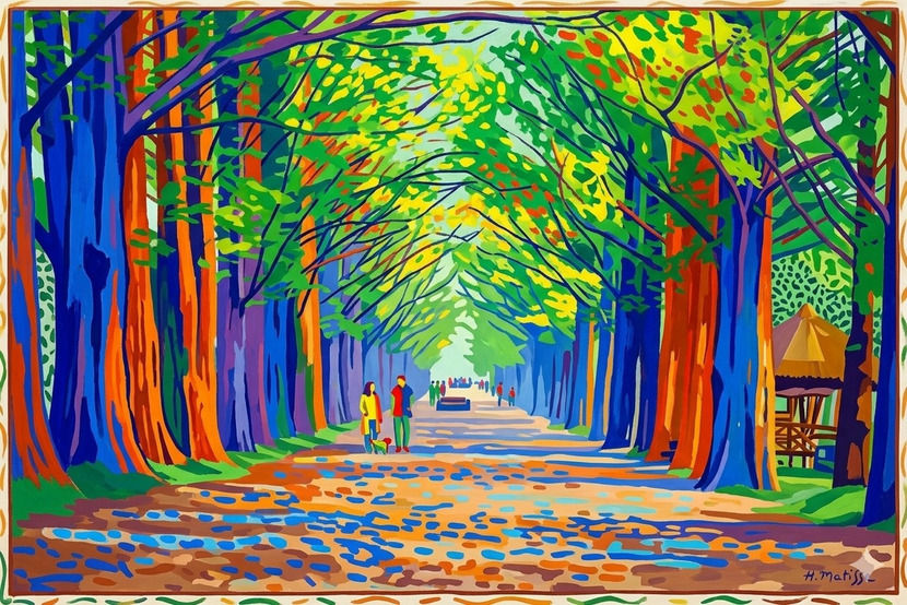 해방된 색채의 향연: 실제 나무의 갈색과 초록색에서 벗어나, 나무 기둥은 강렬한 오렌지색과 짙은 블루로 그려졌습니다. 이는 보색 대비를 통해 화면에 폭발적인 에너지를 부여하며, 가로수길이 지닌 생명력을 시각적으로 극대화합니다.