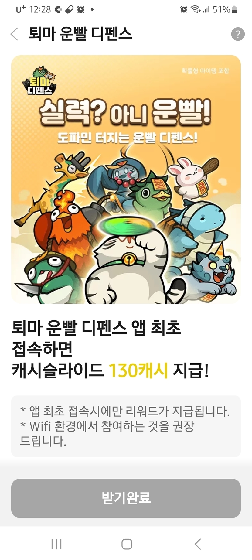 퇴마 운빨 디펜스. 앱 최초 접속하고 130캐시