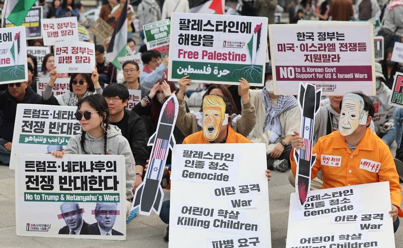 한국인과 재한 팔레스타인인, 재한 미국인 등 참석자 약 200명은 이란을 공격 중인 도널드 트럼프 미 대통령과 베냐민 네타냐후 이스라엘 총리를 규탄했다. 또 이스라엘의 팔레스타인 공격 역시 멈춰야 한다고 주장했다. 이들은 양국 공습으로 숨진 이란 아이들의 사진과 책가방을 늘어놓는 퍼포먼스도 했다.