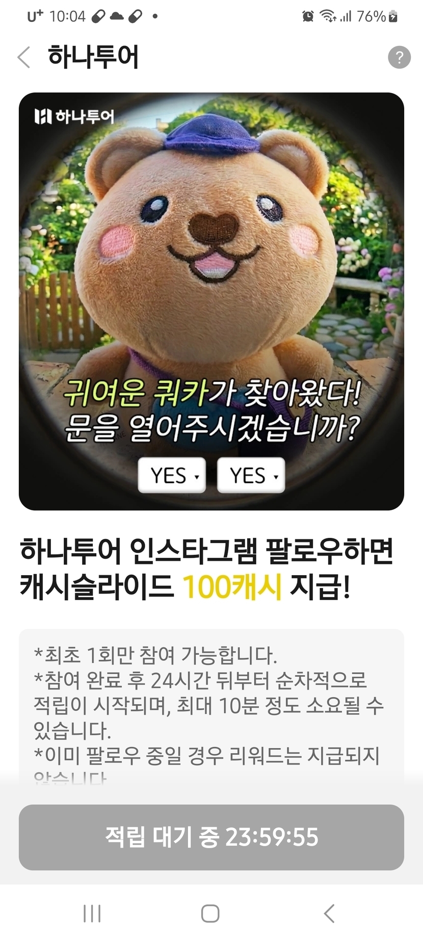 하나투어 인스타그램 팔로우 24시간후 100캐시