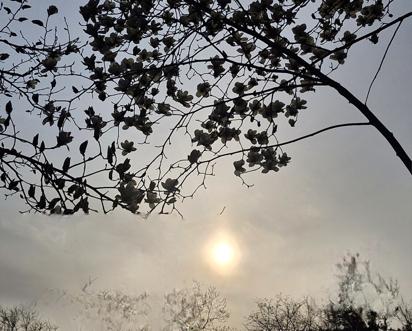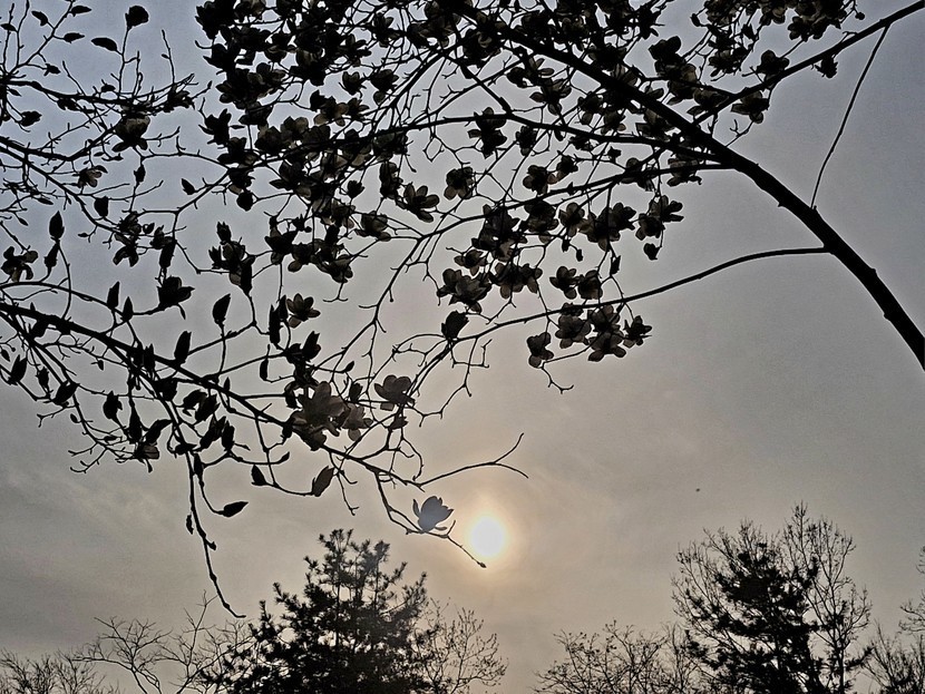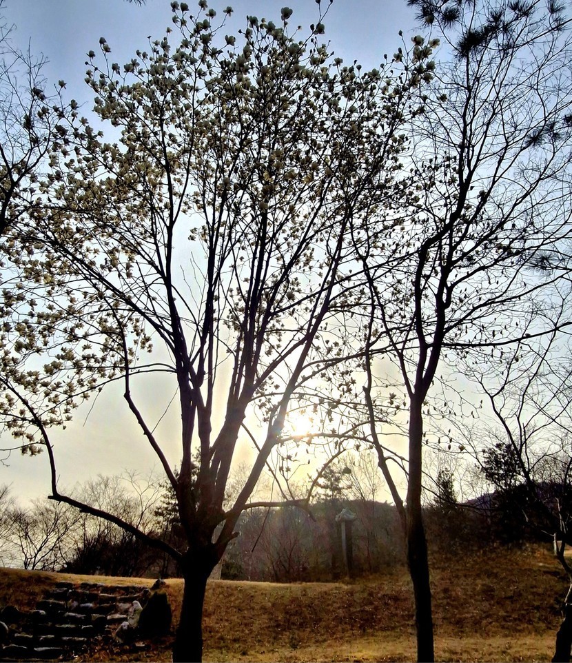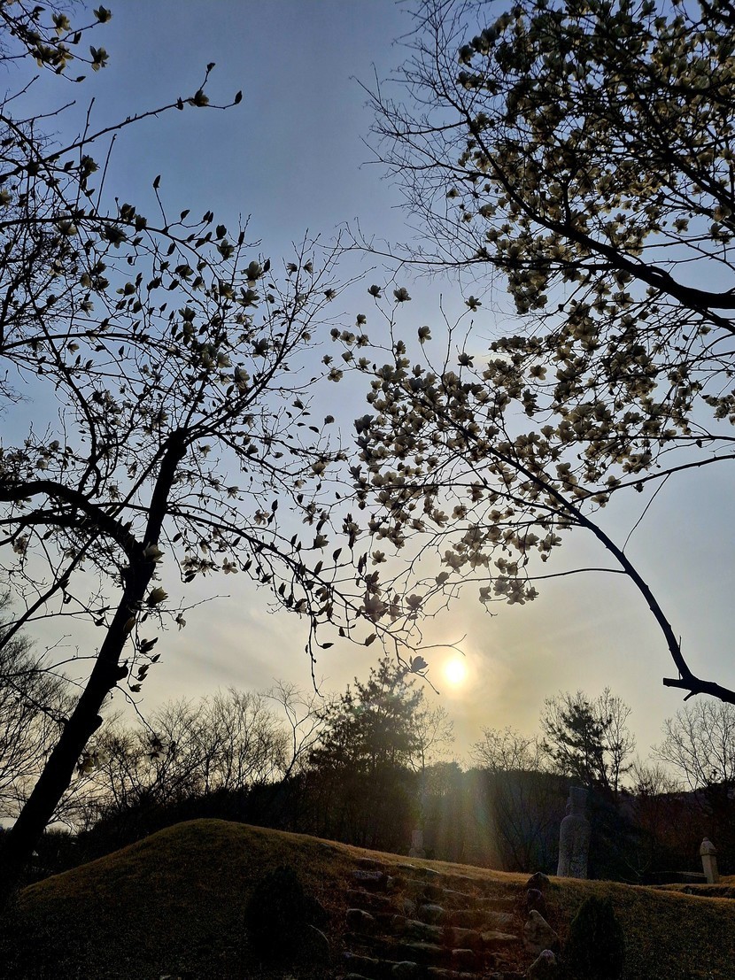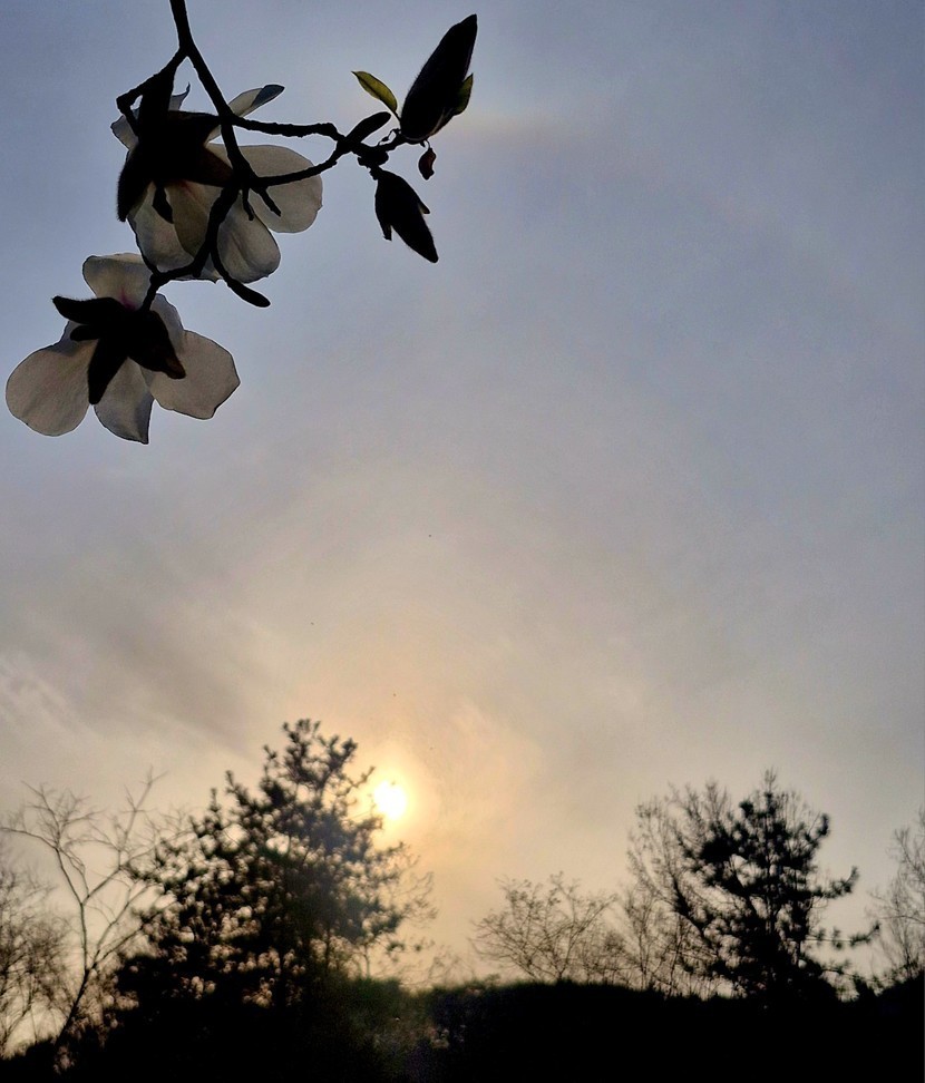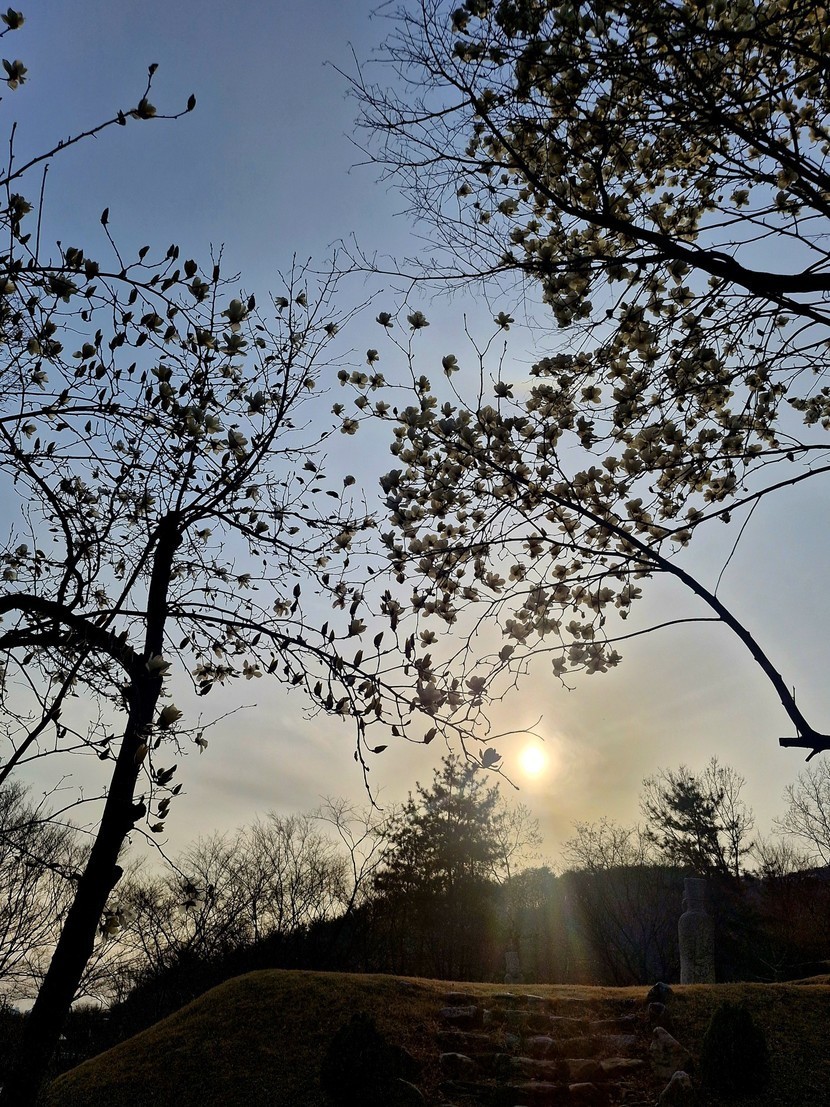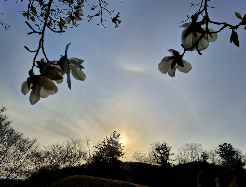 목련꽃 너머로 노을이 내려앉네요