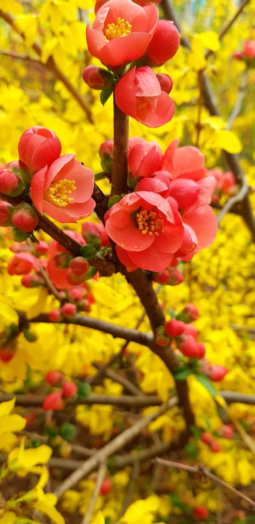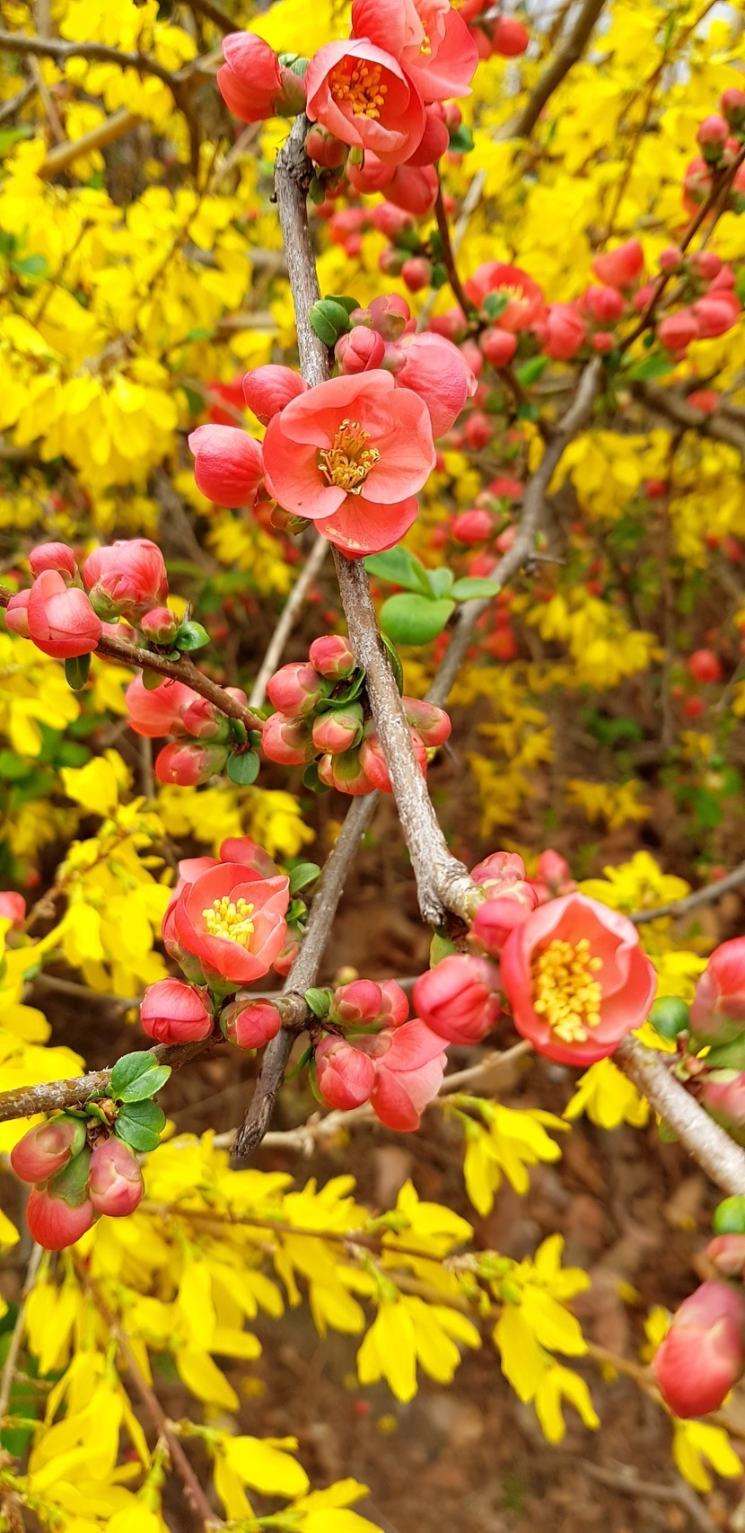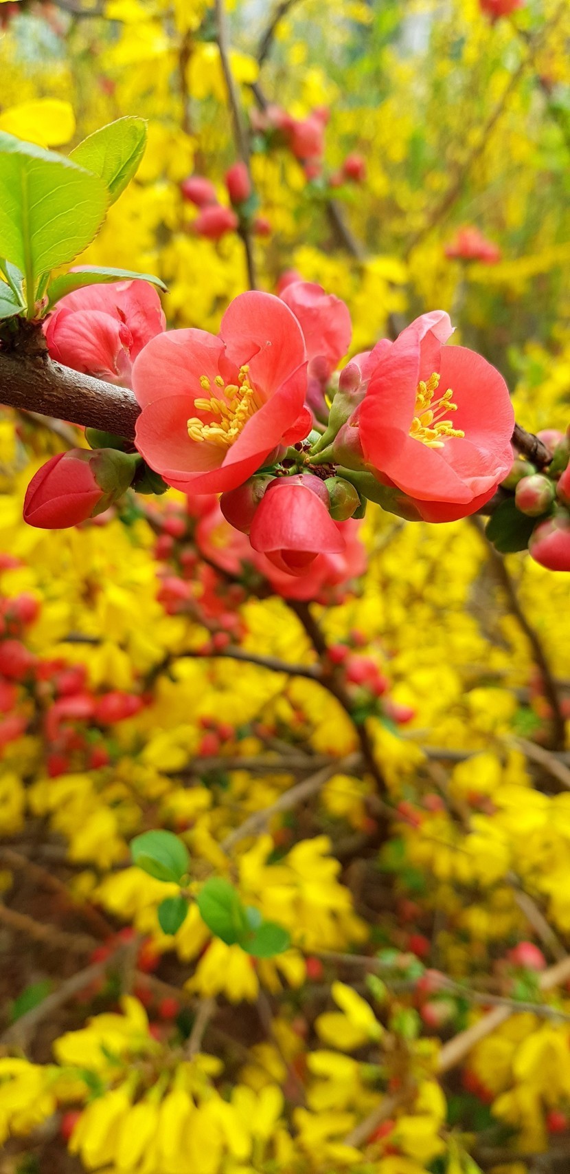 빨강노랑 명자나무 꽃과 개나리