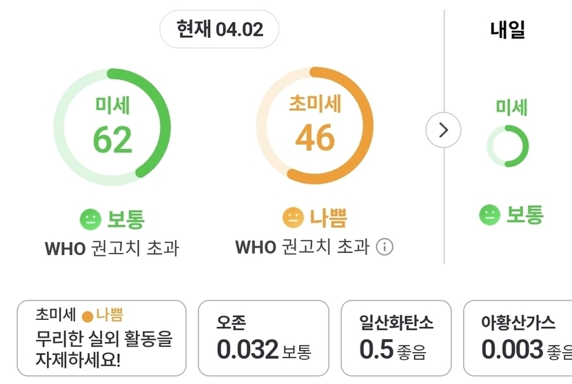 미세는 보통~.초미세는 나쁨으로 ~