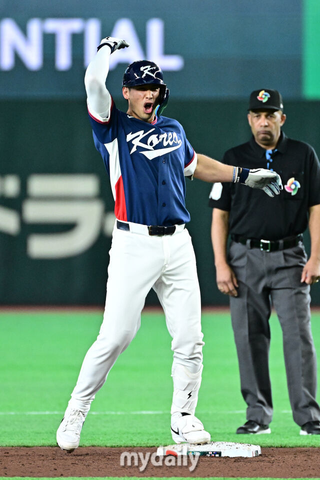 위트컴이 6회초 첫 타자로 나와 2루타를 친 후 기뻐하고 있다./마이데일리