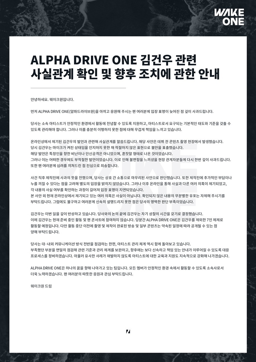 이에 대해 웨이크원이 입장을 밝히게 된 것. 소속사는 먼저 온라인상에서 제기된 김건우의 발언과 관련해 "데뷔 전 콘텐츠 촬영 현장에서 발생한 것으로, 당시 김건우는 마이크가 켜진 상태임을 인지하지 못한 채 부적절한 표현으로 불만을 표출했다. 특정인을 향한 비난이나 인신공격은 아니었으며, 혼잣말 형태로 나온 것"이라고 해명했다.