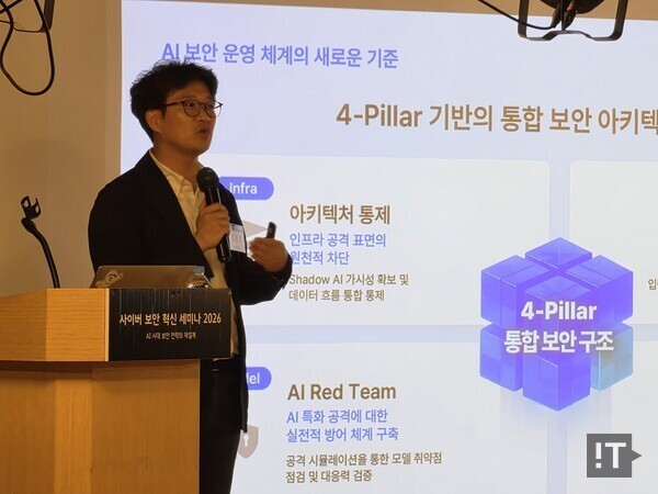 이에 대한 대응으로 그는 보안을 내재화해 설계된, 통칭 ‘시큐리티 바이 디자인(Security by Design)’ 기반의 통합 보안 체계를 제시했다. 인프라 단계에서는 AI 자산 식별부터 시작해 보안을 전제로 한 아키텍처 설계를, 데이터 영역에서는 입력·출력 통제를 위한 AI 가드레일 적용을 강조했다. 또한 AI 레드팀을 통한 취약점 검증과 함께, 전사 차원의 거버넌스 및 규제 대응 체계 구축이 필요하다고 설명했다. 김진호 리더는 “AI 보안은 단일 솔루션이 아닌 다층 방어 체계로 접근해야 한다”며 “설계부터 운영까지 이어지는 통합 보안 프레임워크가 필요하다”고 말했다.