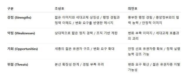 조 후보가 세종에 '세대교체' 바람을 일으킬 수 있을지도 관전 포인트다. 조 후보는 1970년생으로 1956년생인 최 시장과 비교했을 때 비교적 젊은 정치인으로 분류된다. 앞서 당내 경선 과정에서도 1955년생인 이 전 시장을 꺾었다. 기존 정치 질서를 대표하던 인물이 탈락하고 조 후보가 선택됐다는 것은 유권자들의 변화 요구가 반영된 결과로 해석된다. 이는 단순한 인물 경쟁을 넘어 세대교체의 가능성을 보여준다.