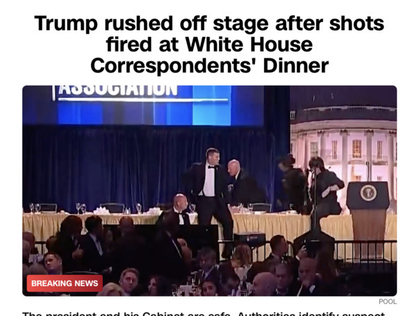 아래는 CNN의 속보 ‘Trump and his Cabinet safe after shots fired at White House Correspondents' Dinner’(백악관 출입기자단 만찬 행사장 총격…트럼프와 내각 인사 전원 무사)라는 제목의 기사 전문이다. (편집자)