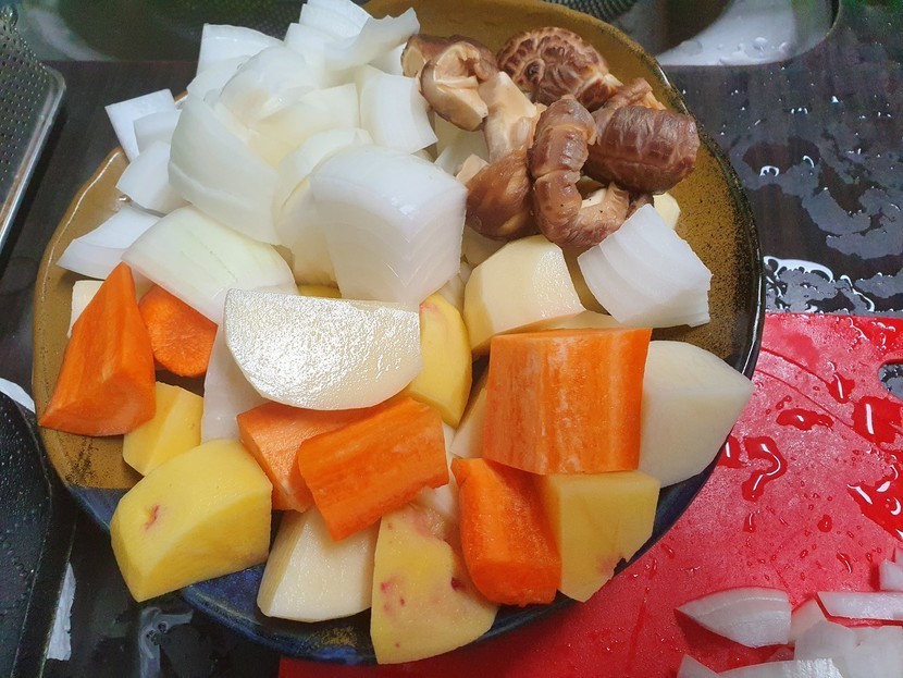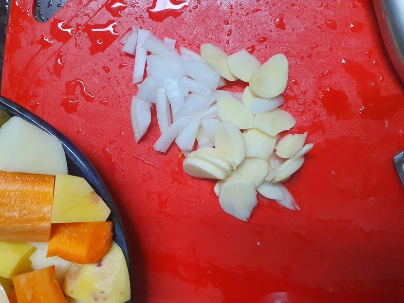 나머지 양파는 크게 깍둑썰어두시고 감자, 당근, 버섯, 다 같은 크기로 깍둑 썰어주세요.