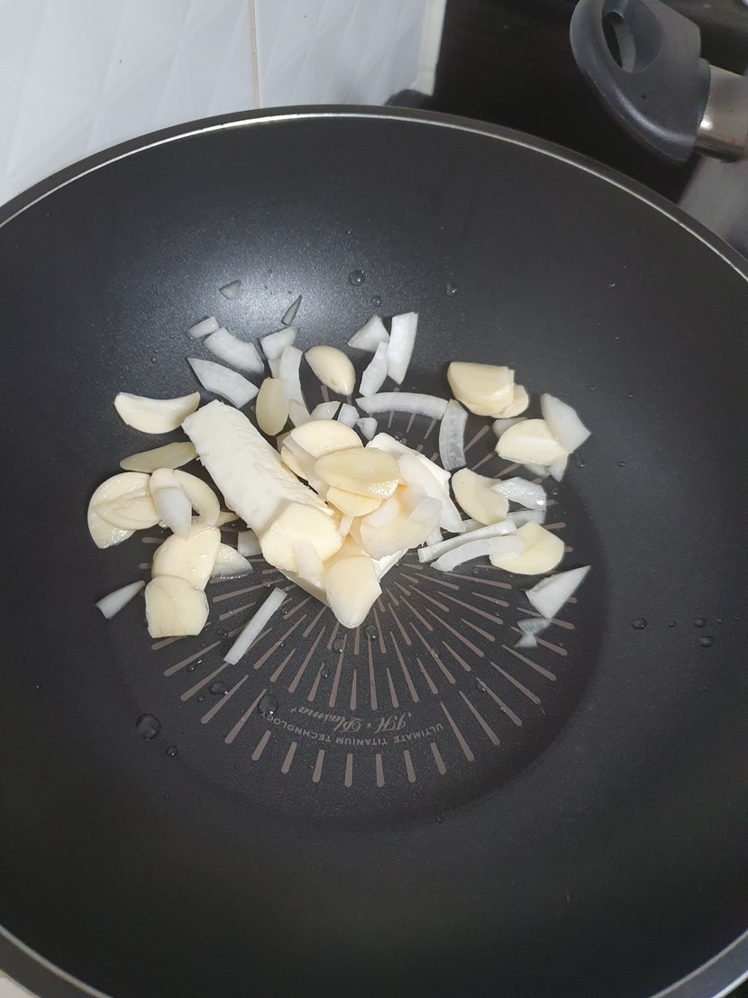 마늘은 편썰어주시고 양파 조금은 다져주세요.