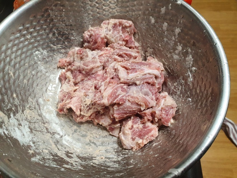 소고기에 물기를 빼주시고 소금, 후추 간 해주시고 밀가루에 버무려주세요.