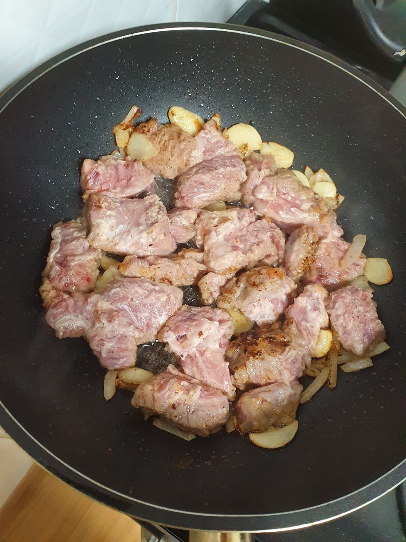 향이 올라오면 고기를 넣고 겉을 익혀주세요.