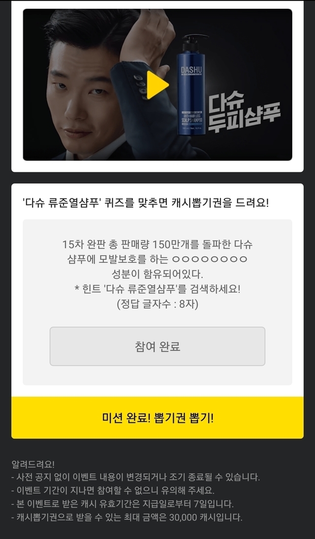 19.11.27 146 읽음 카카오페이지 류준열 다슈샴푸 별일이네 구독하기 2 5 콘텐츠의 수익 27 카카오페이지 캐시 뽑기권 정답은~?!다슈에서 캐시뽑기권을 드립니다8글자 정답은 ' 나이아신아마이드 ' 5 0 / 300 입력