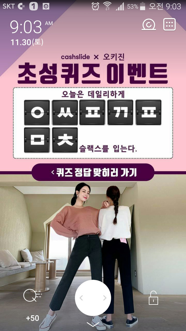 19.11.30 73 읽음 9시 초퀴 : 인싸핏깡패맞춤 prosolo 구독하기 1 3 콘텐츠의 수익 30 9시 초성 퀴즈 정답인싸핏깡패맞춤근데 단가가 왜 50원 이지 아시는분 ???? 3 0 / 300 입력