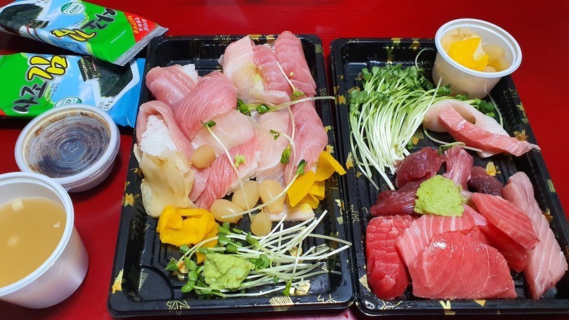 참치회 먹었는데 갖고 오다가 다 흔들렸네요 ㅠ