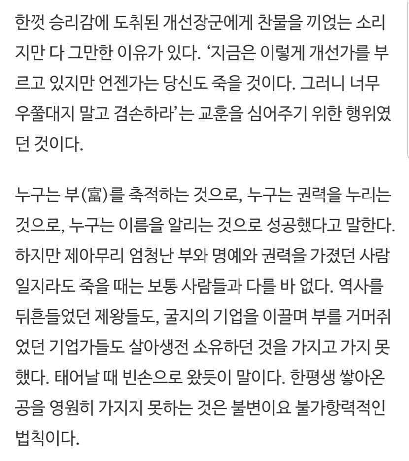 21.12.10 3,433 읽음 메멘토 모리 [Memento Mori ] cho6875 구독하기 111 107 콘텐츠의 수익 17 겸손하게 행동하라."메멘토 모리!"[Memento Mori]라틴어로 "죽음을 가억하라" 라는 뜻인데, '전쟁에서 승리했다고 너무 우쭐대지 말라' 오늘은 개선 장군이지만 너도 언젠가는 죽는다. 그러니 겸손하게 행동하라.' 이런 의미에서 생겨난 풍습이라고 한다. 107 0 / 300 입력