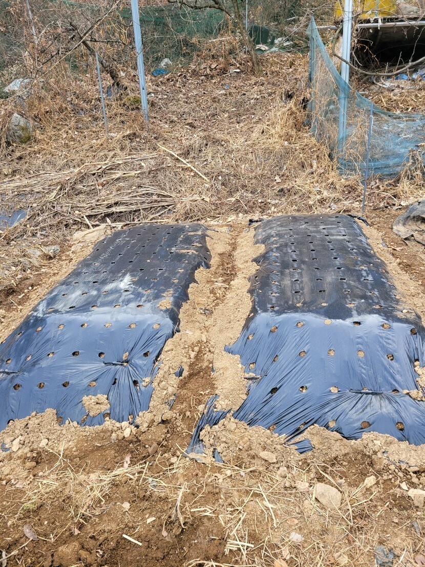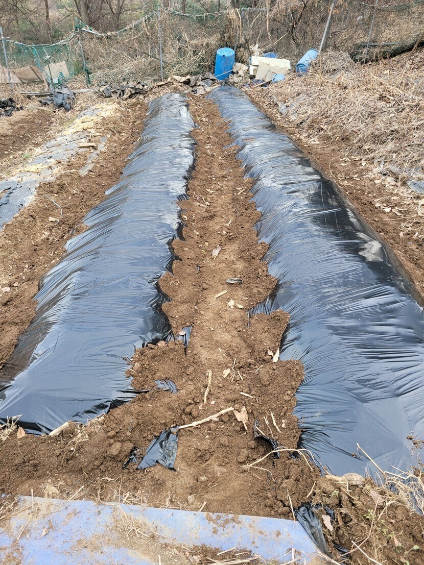 거름뿌리고 땅을 갈고 검정비닐을 씌워주는것 부터 텃밭농사는 시작합니다.