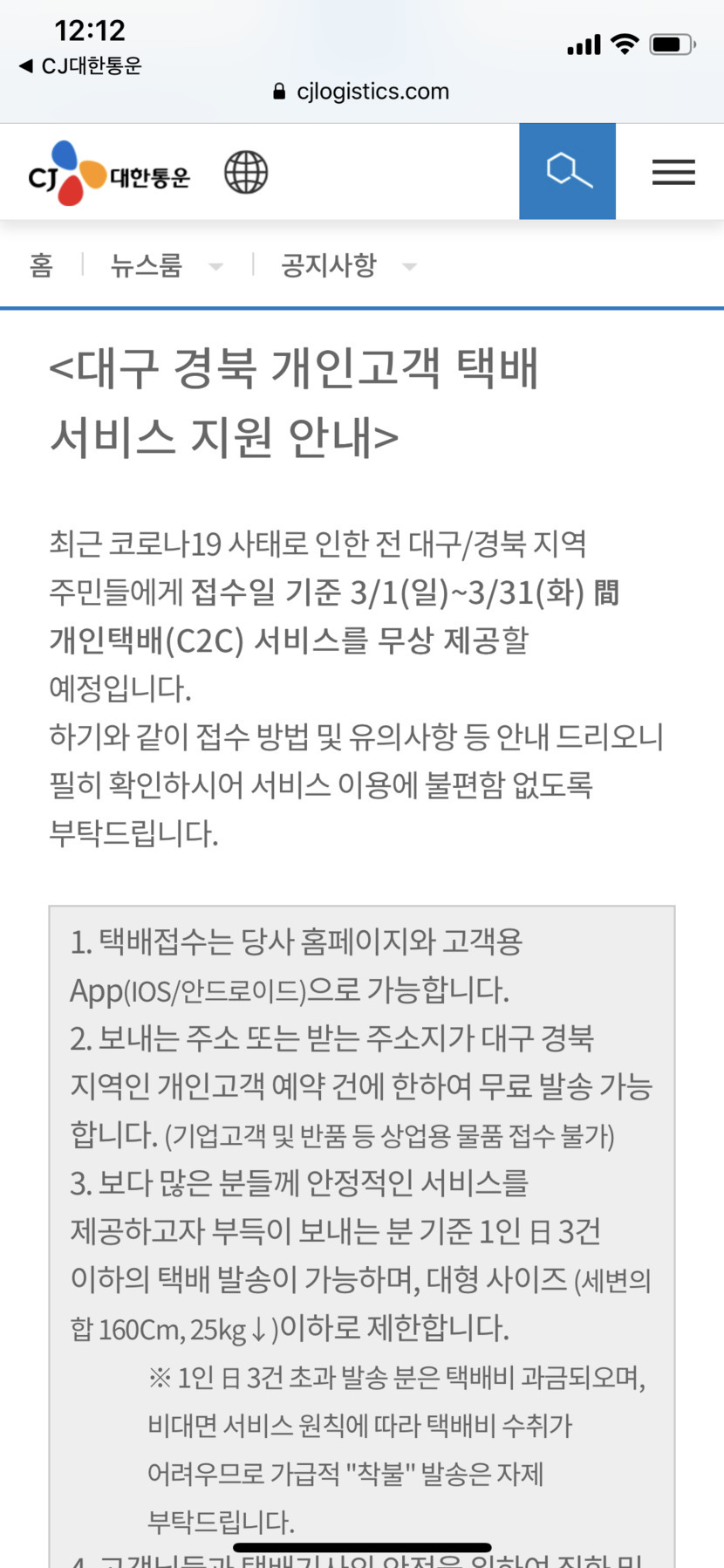 20.03.06 123 읽음 택배 무상제공 이벤트 알림 feat.대구힘내랏!! alsekgmls12 구독하기 0 13 콘텐츠의 수익 16 코로나19때문에 힘든 대구 경북 지역 주민들을 위해 CJ택배에서 3월 한달간 대구/경북 지역 관련 개인택배를 무료로 제공한다는 공지가 있어서 가지고 왔어요!! 개인적으로 시댁이 대구라 이것저것 보낼게 많을것 같았는데 감사하네요~ 대구도 대한민국도 전세계도 다같이 이겨내자구요❤️❤️ 13 0 / 300 입력