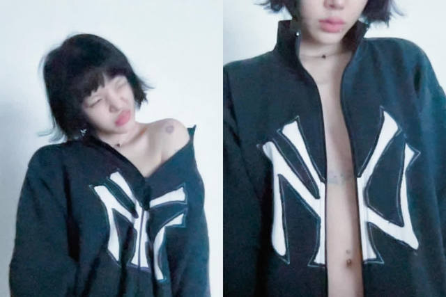 0 지퍼를 살짝 내린 채 한쪽 어깨를 드러낸 신지민은 한쪽 어깨를 드러내며 장난스러운 표정을 짓고 있다.