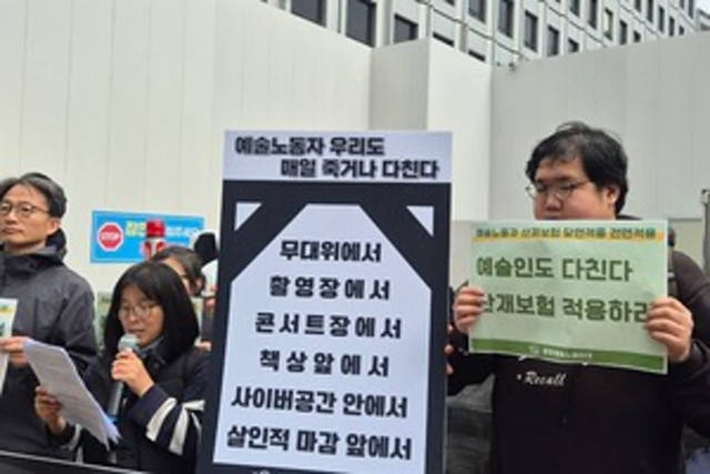 0 정부는 ‘전국민 산재보험’을 내걸고 전문가 논의를 진행하고 있지만, 당사자 참여를 배제하고 있다는 현장의 우려가 높다.문화예술노동연대는 6일 서울 중구 근로복지공단 서울지역본부 앞에서 기자회견을 열고 “이재명 정부는 제대로 된 예술노동자 산재보험 제도 설계를 위해 문화예술 노·사·정 테이블을 재개하라”라고 요구했다.이들에 따르면 고용노동부는 6일 ‘산재·보상·일터복귀 종합지원단’ 회의를 열고 예술인 산재보험 적용 방안을 논의했다.