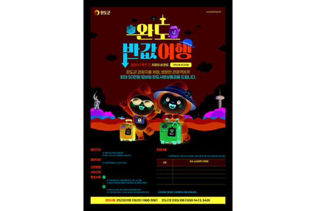 0 ‘완도 여행 반값으로!’ 지역 사랑 휴가 지원제 안내 포스터 (사진=완도군) 전남 완도군이 문화체육관광부와 한국관광공사가 인구 감소 지역의 관광 활성화를 위해 추진하는 ‘지역 사랑 휴가 지원(반값 여행)’ 시범 사업 대상지로 선정돼 본격적으로 관광객 맞이에 나선다.‘완도 반값 여행’은 관광객이 완도에서 숙박, 식사, 체험, 특산품 구매 등을 통해 지출한 비용의 50%를 완도사랑상품권(모바일)로 돌려주는 사업이다.지원 대상은 인접 지역(해남군, 강진군)을 제외한 타 지역에서 완도로 여행을 온 관광객이다.