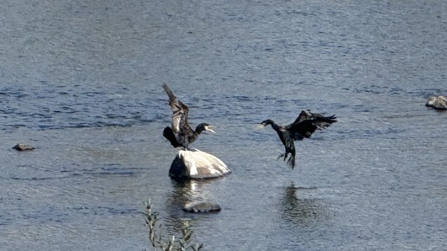 산책길에 가마우지가 영역 다툼 하는 장면을 보고 말았네요ㆍ저기 바위위에 앉은 새가 다가오는 새를 쫓아내는 장면입니다ㆍ 쫓겨나는 새가 다음장면에 물에 빠지는 장면인데 ᆢ 사진을 못찍었네요 ㅋㆍ호박꽃을 찾아 꿀을 채집 하는 꿀벌