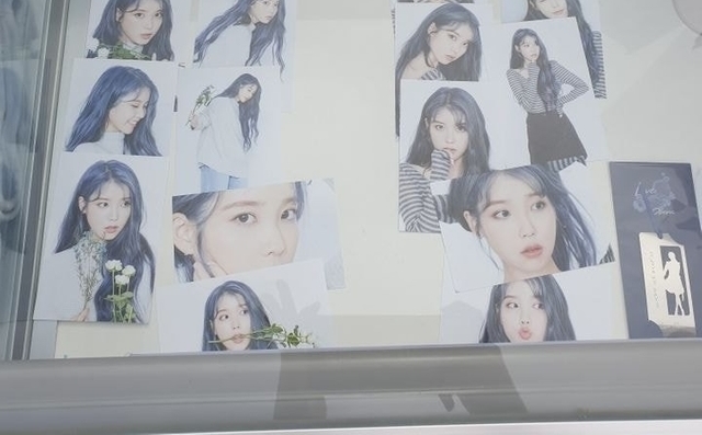 실시간 콘서트 MD로 팔고있는 파란 머리로 염색한 아이유 화보