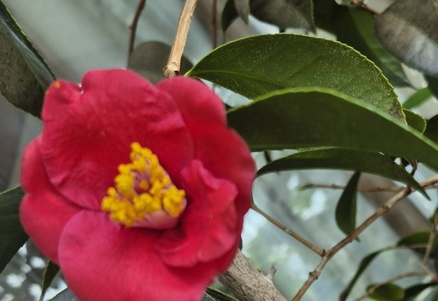 노란수술이 더 돋보이는 빨간동백 꽃