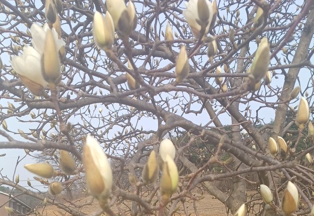 목련과 개나리가 꽃망울을 머금고 반짝