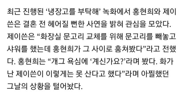 `냉장고` 제이쓴 "홍현희, 결혼 전 샤워하는 날 훔쳐봐…헤어질 뻔"