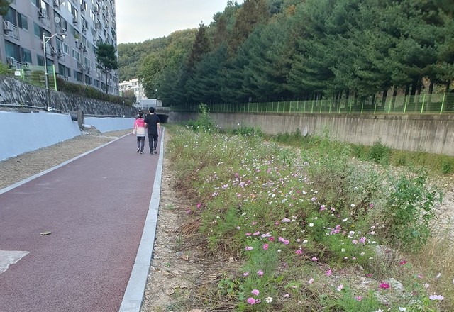 저녁을 들고 아내와 함께 산보하러 수암천변도로 걸어서 가는데 가을 막바지에 몇가지 색으로 길가 하천변으로 가을의 향취를 내고 있었다. 참 으랜만에 보니 어릴 시절 잠자리채같고 곤충 채집하던 추억이 물씬 났다.참 즐거웠었는데