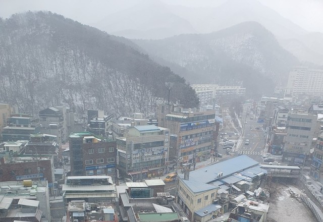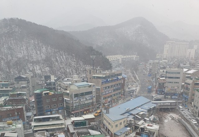 내가 밖에 나갔다가 집에 들어오니 눈발이 날리다가 강한 바람이 동반하면서 두번째 사진은 눈이 산과길과 나무에도조금 붙어있는 것은 카메라에 안 잡혀 눈 내래는 살감할 수 없요.다음에 잘 찍머 볼께요.