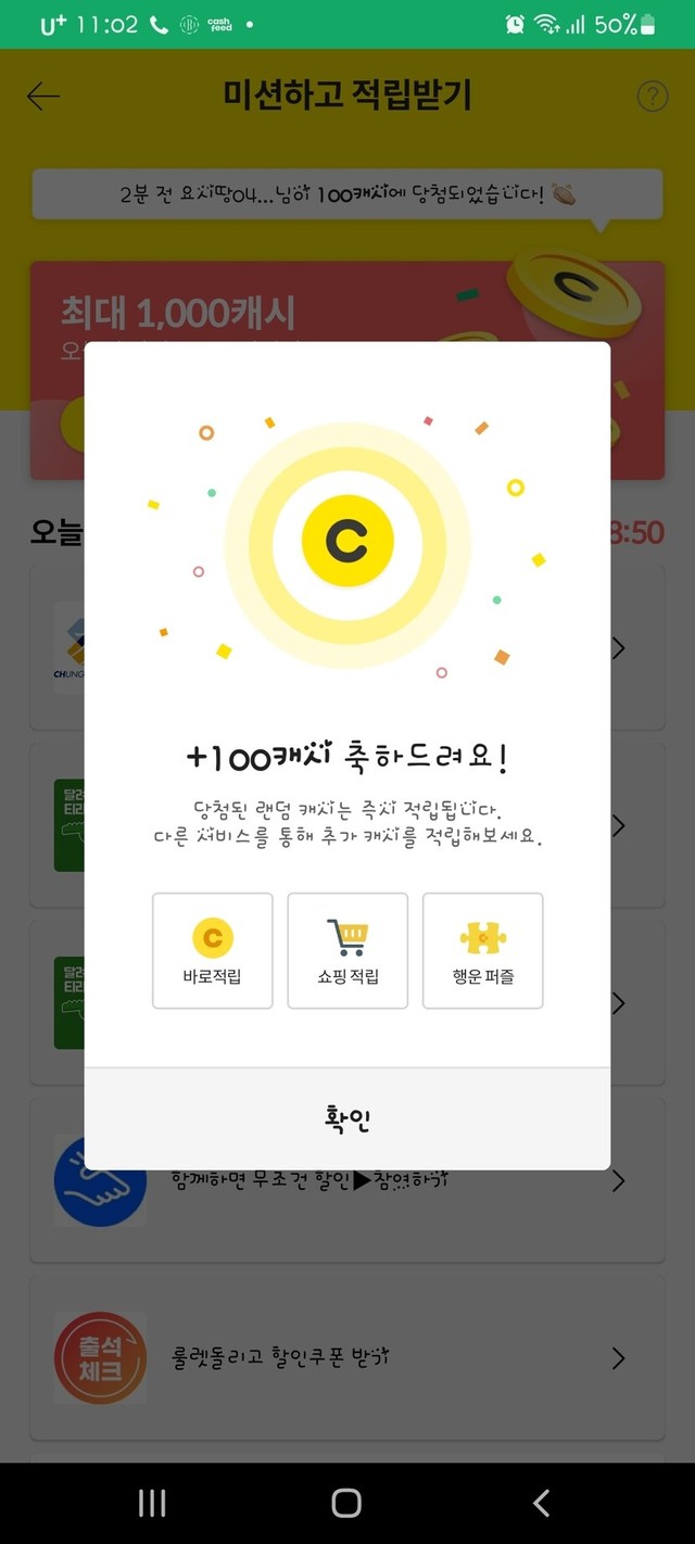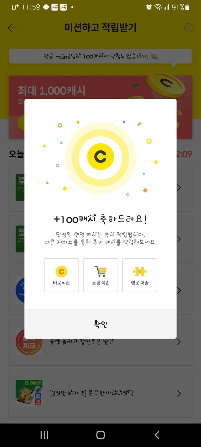 오랜만에 100캐쉬 당첨 !!