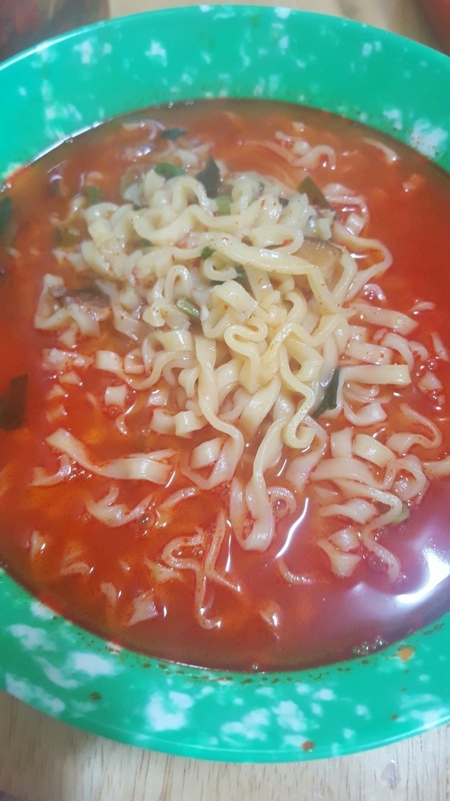 야식으로 먹은 육개장칼국수!!칼칼하고 맛있네요청양고추 넣어먹으면 더 맛있어요~