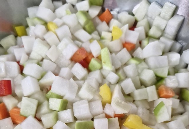 무1개 파프리카사서 작게 썰어 1시간소금에 절입니다.꼬맹이들 매운 고추가루대신 빨간색아프리카르로갈아서 넣었습니다.양파. 마늘. 밥 .사과. 배 참치액넣고 갈아서 버무렸더니 아이들도 잘먹습니다.