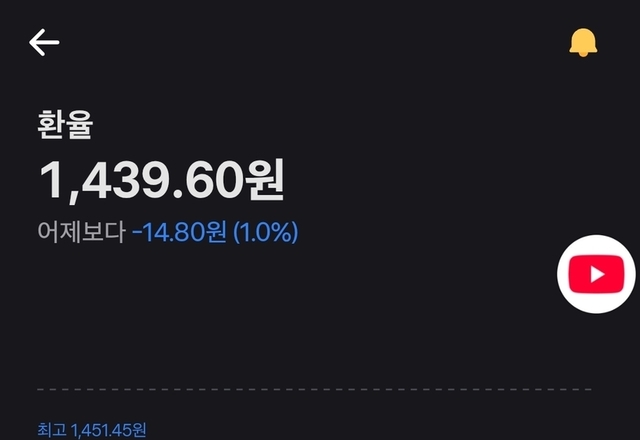 환율이 오랜만에 1450원 아래로 내려왔네요.기념으로 1443원쯤에서 살짝 바꿨는데, 1436원까지도 내려갔었네요. 😂 😂 역시 바닥 잡기는 불가능하지만, 조금씩 바꿔놓으니 마음이 뭔가 편해지는것 같기도해요~미장에 참여하려니 환율이 무시할 수 없네요.여전히 고환율이라 하루빨리 1400원 아래로 내려가주길...