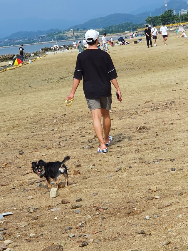 해수욕장 파도에 몸이 젖어도 성큼성큼 걷기고하고 맘껏 즐기는 울공주